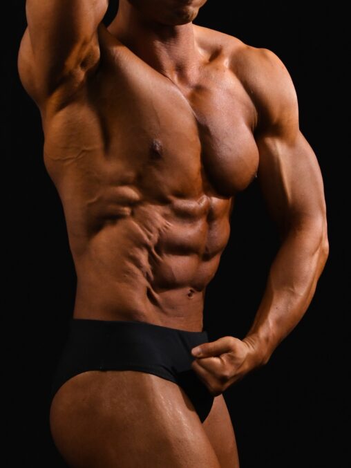 明るい背景かつハード照明で筋肉のカットを強調するフィット…